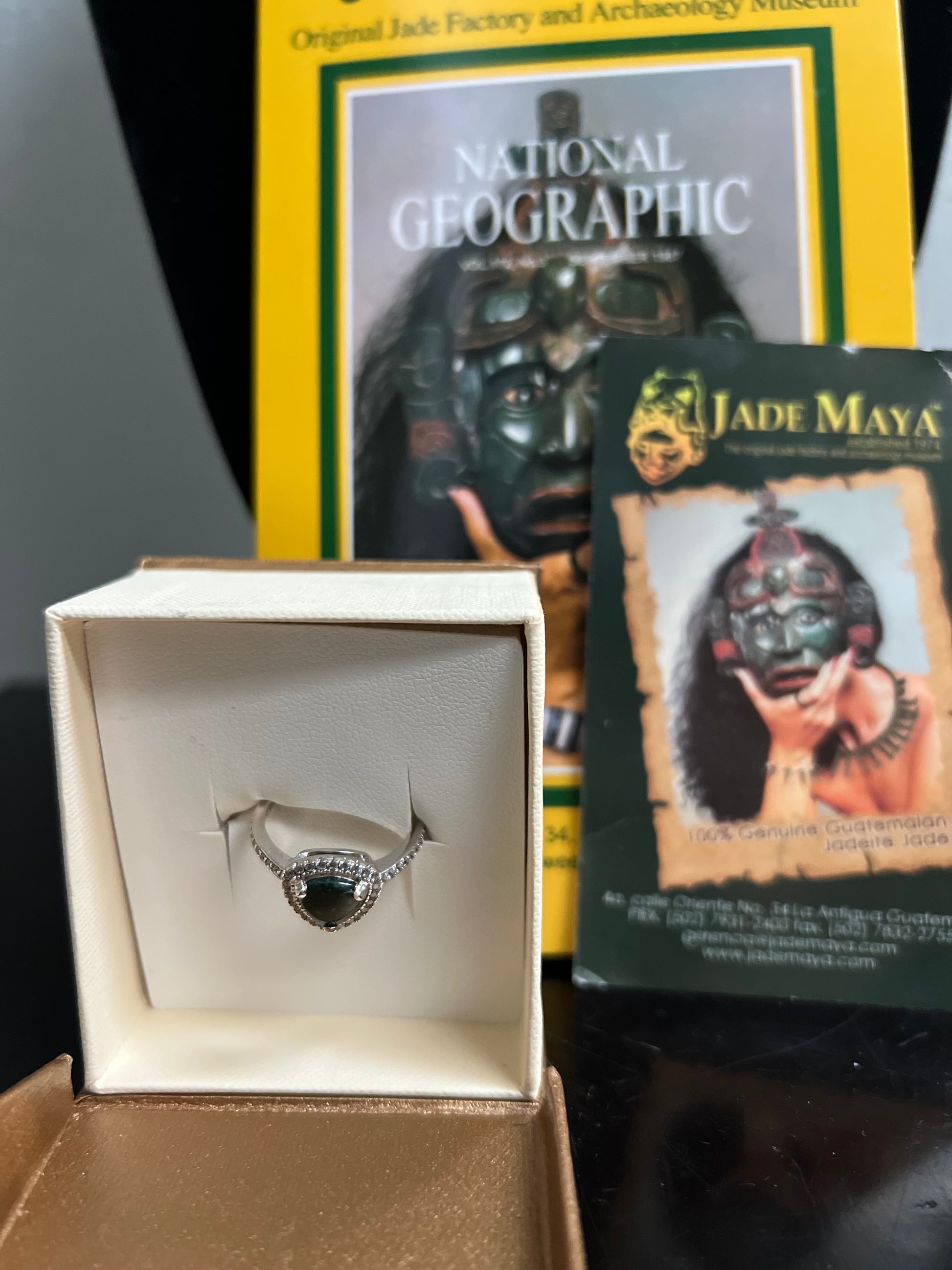The ring comes in packaging that highlights its authenticity as "100% Genuine Guatemalan Jadeite jade" from the "Original Jade Factory and Archaeology Museum". We are a authorized dealer for Jade Maya