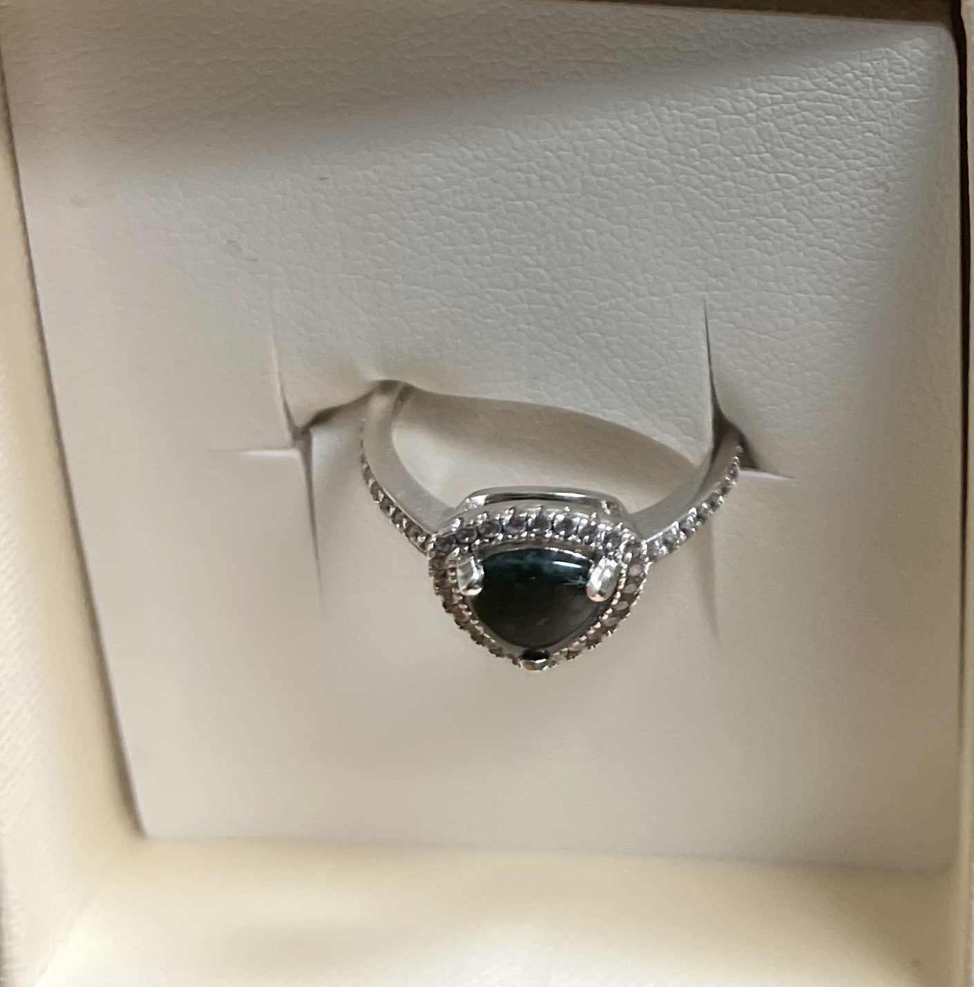 Design The central jadeite stone is pear-shaped and set within a halo of small, clear accent stones, likely diamonds or cubic zirconia.